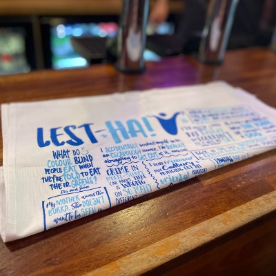 Barry D Bulsara's wonderful ‘Lest-Ha!’ print is now available on a tea towel. The design features jokes from comedians who regularly perform at the annual Leicester Comedy Festival.